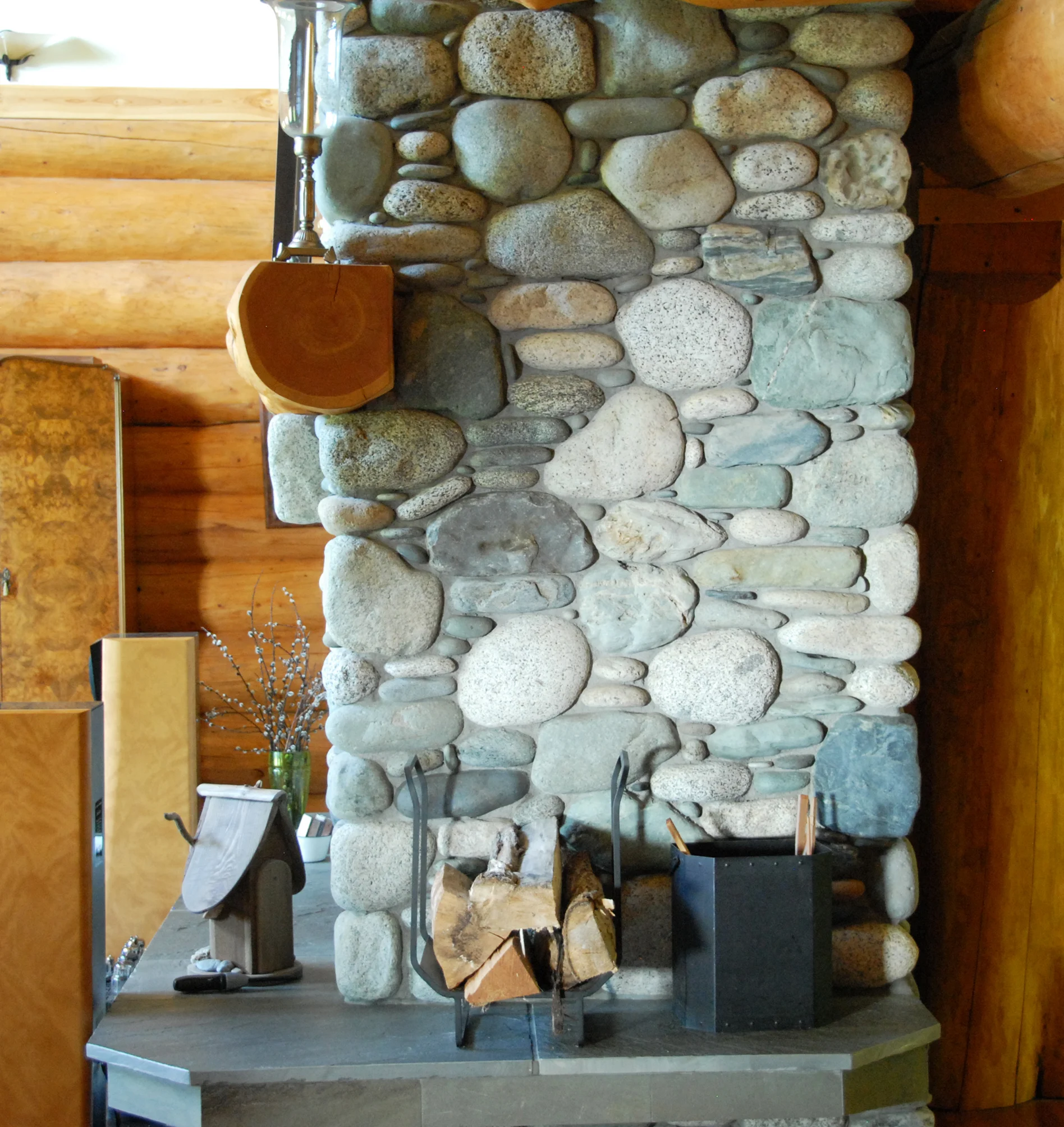 Side view of river rock fireplace, fir log mantel and bluestone hearth
