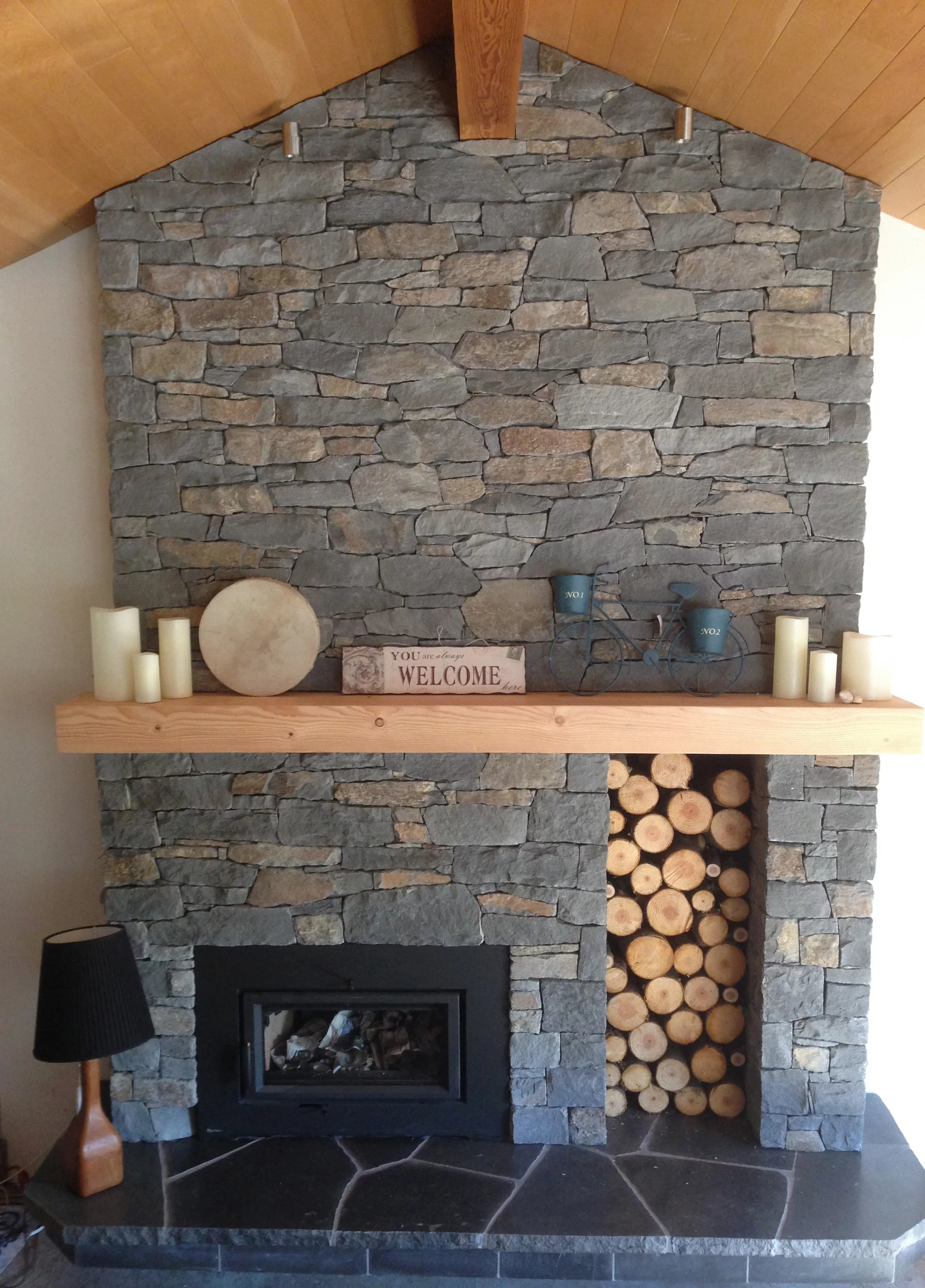 Fireplace renovation - replaced aging brick with new materials, basalt and fir